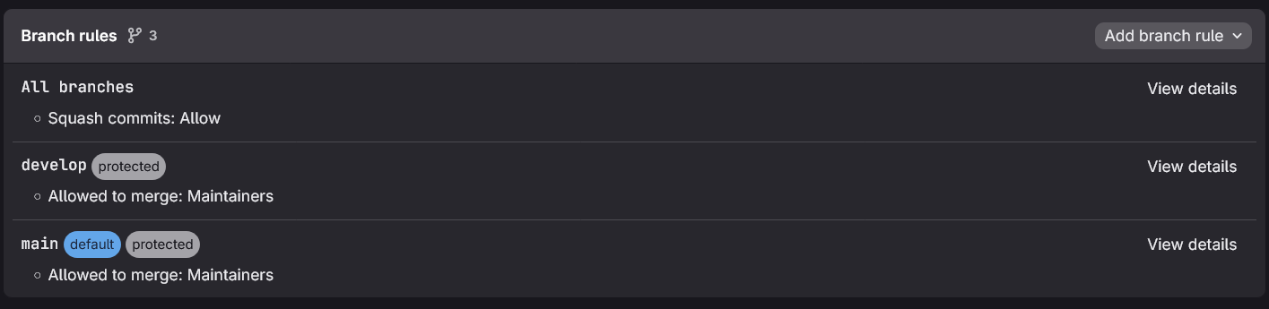 Nous allons protéger nos branches. En effet, nous souhaitons que les branches develop et main ne puissent plus être supprimées et que personne ne puisse envoyer du code directement dessus. Pour vous aider, vous trouverez la documentation à cette adresse (vous ne devez pas tout lire, la documentation va plus loin que nécessaire) : https://docs.gitlab.com/user/project/repository/branches/branch_rules