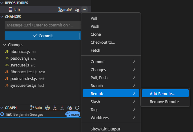 Retournez dans VSCode, cliquez sur les ... à côté de REPOSITORIES > Remote > Add Remote...