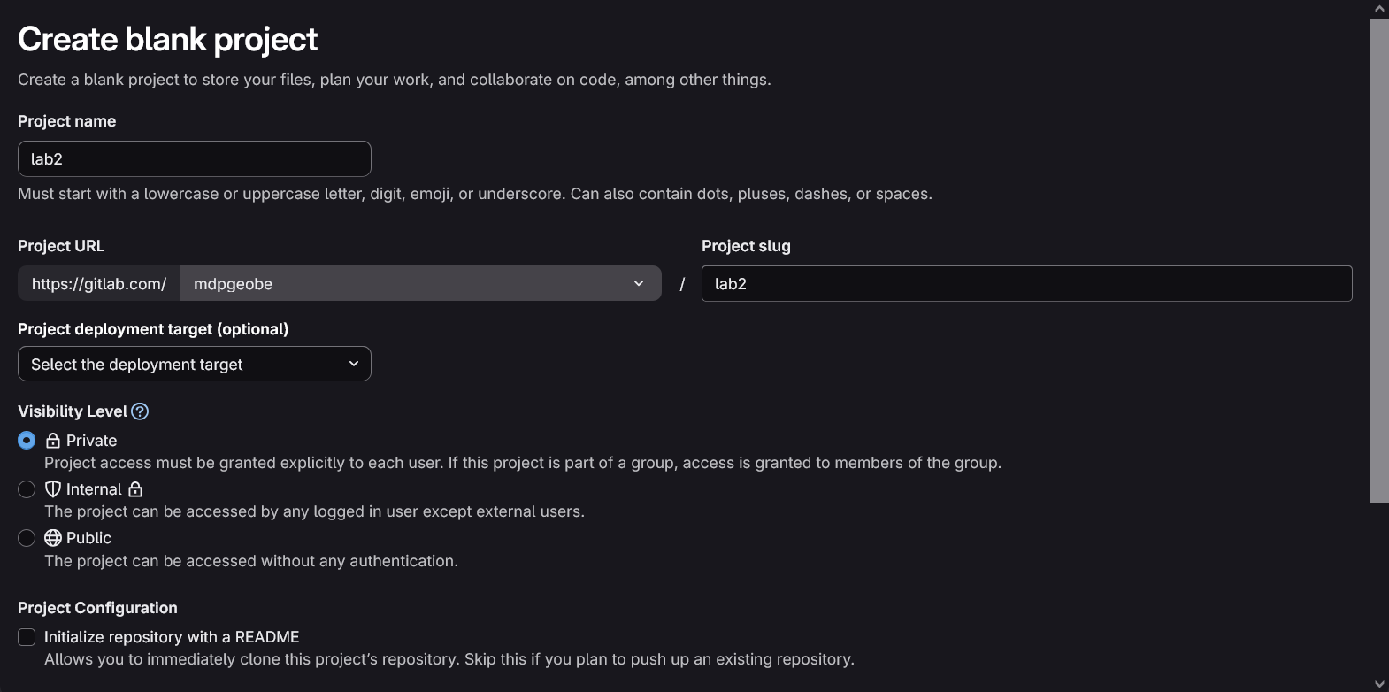 Choisissez le nom que vous voulez pour le projet. Le "projet slug" se mettra automatiquement à jour en fonction du nom, vous ne devez donc pas y toucher. Vérifiez bien que la visibilité de votre projet soit "privée" et que la case "Initialize repository with a README" ne soit pas cochée.