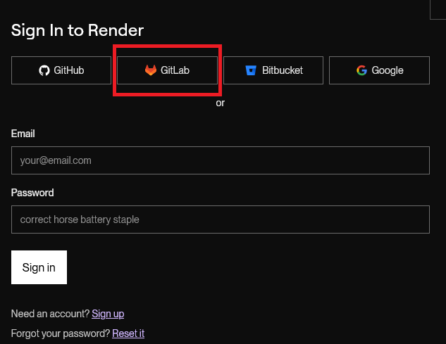 Rendez-vous sur la plateforme Render et inscrivez-vous en utilisant votre compte Gitlab.