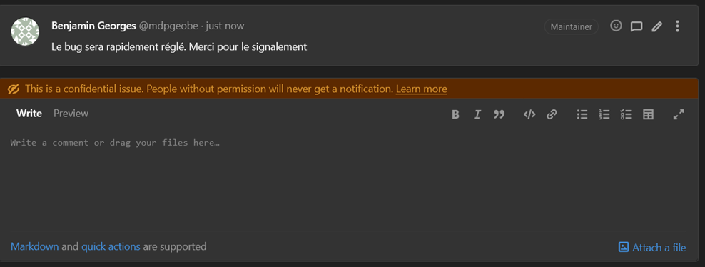 Ceci aura pour conséquence de voir la progression de la résolution du bug dans l'issue.