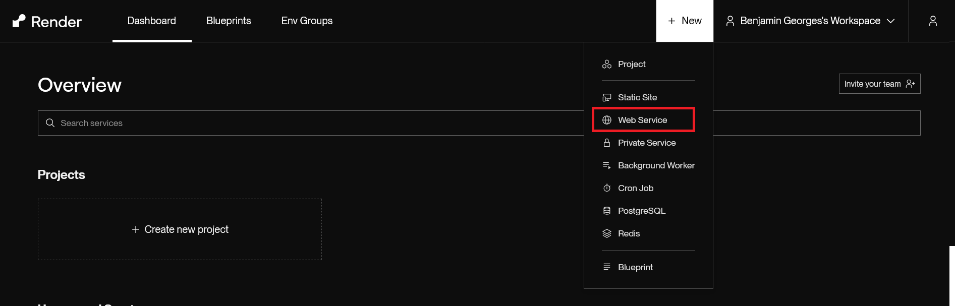 Avant de continuer sur GitLab, retournez sur le site Render et nous allons préparer nos serveurs web pour le déploiement en continu ! Sur le dashboard, cliquez sur "web services"