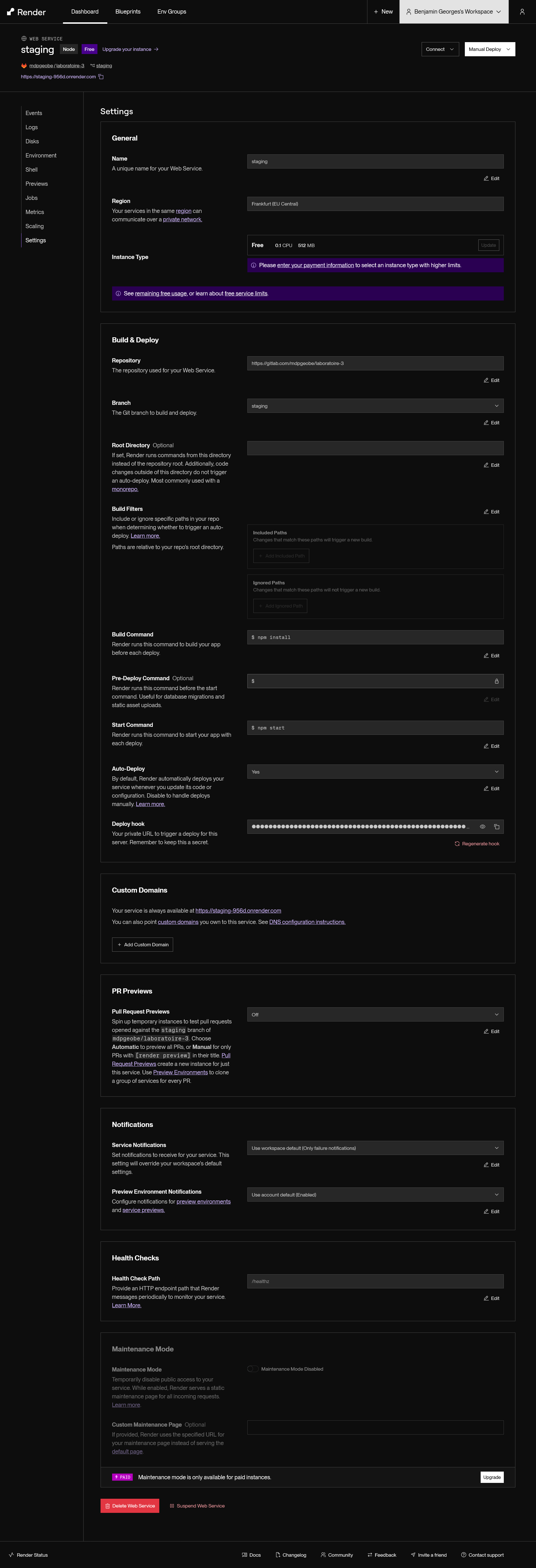 Créez un deuxième service, mais pour la branche main.