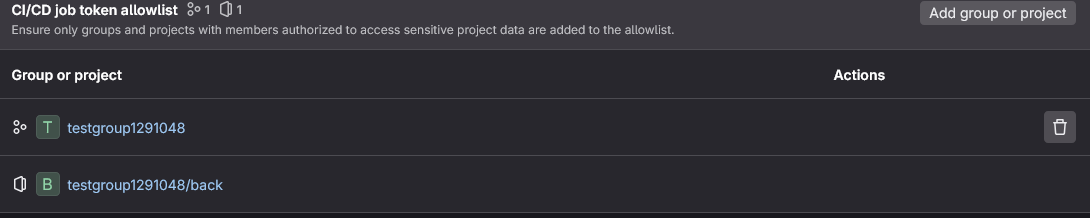Toujours dans la partie Setting > CICD, dans Job token permissions, ajoutez le groupe.