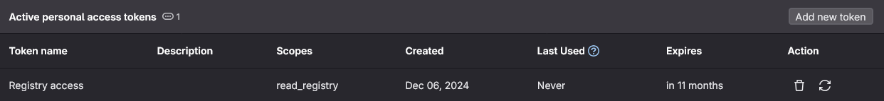 Parfait ! Il ne nous reste plus qu'une dernière chose à faire. On aimerait pouvoir se connecter à ce registry depuis l'extérieur. En effet, il existe des cas où ce sera le serveur distant qui va se connecter à notre registry. On pourrait également imaginer un cas où un développeur aimerait récupérer l'image produite par nos pipelines pour les étudier. Dans ce cas, il faut un token d'une "entité" (une personne ou un groupe) pouvant accéder au registry.