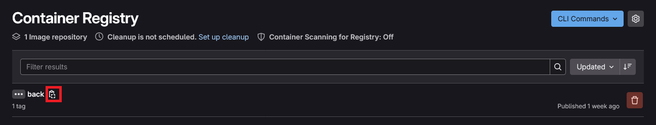 Pour connaître l'adresse du registry, il vous suffit de la copier depuis l'interface. Au niveau de l'image Docker, vous avez un bouton pour copier son adresse.